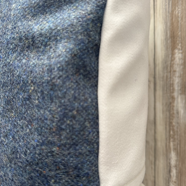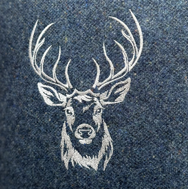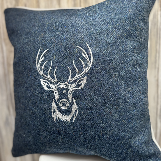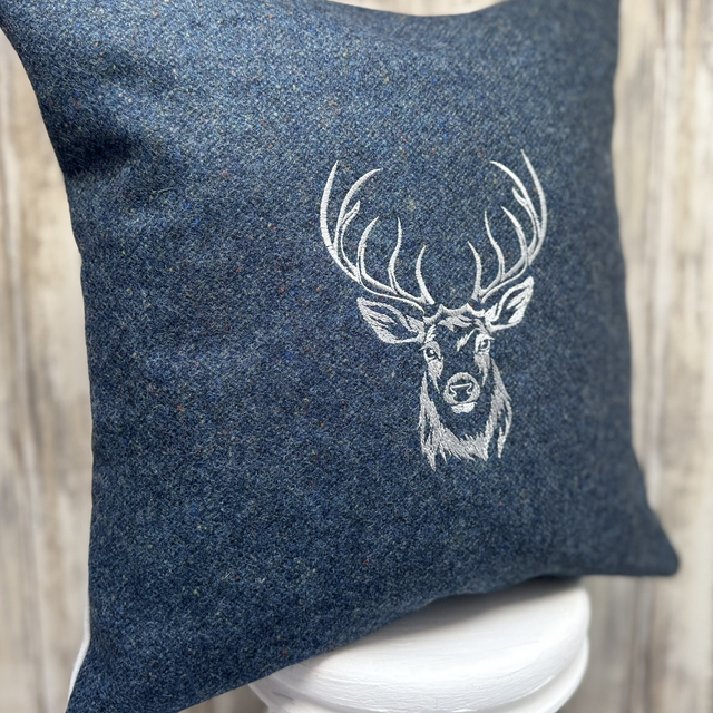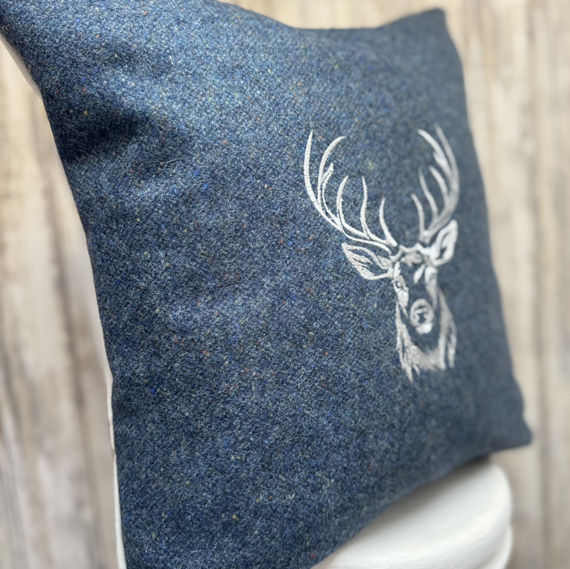 Navy lambswool cushion with a silver embroidered stag and a silver plume satin sheen envelope opening size 16”